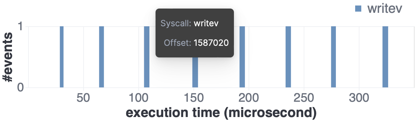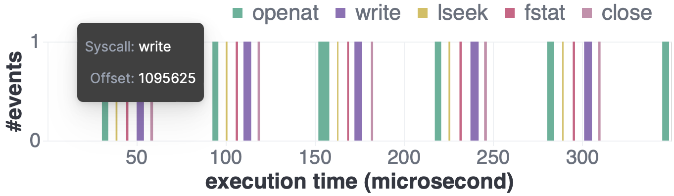 Using DIO to observe I/O access patterns for the log file, we can see the same set of system calls being done repeatedly, with a sequential access pattern (i.e., the offset increases for each set of operations). Further analysing this pattern, we can see the exact order of requests for one of these sets: